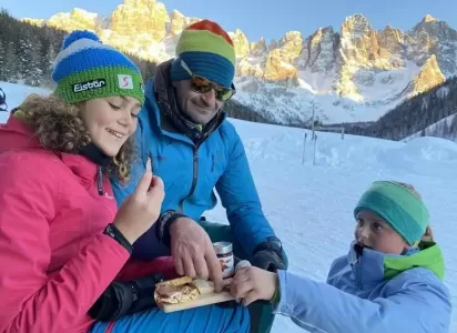 Se non hai mai visto un tramonto sulle Dolomiti o se invece ne hai visti già tanti, non lasciarti scappare questo spettacolo! Il tramonto per eccellenza, uno dei più fotografati del Trentino nello splendido teatro della Val Venegia, bella dal lasciare senza fiato anche chi l'ha vista mille volte. Una facile passeggiata per grandi e piccini in compagnia delle guide del Parco di Paneveggio Pale di San Martino nella candida atmosfera invernale ai piedi delle Pale di San Martino, alla scoperta della Foresta dei Violini, imparando segreti e curiosità per muoversi nel bosco in inverno, tra ostacoli e utili ripari, proprio come fanno i nostri amici animali. E mentre si accendono le luci dell'Enrosadira, Malga Venegia vi aspetta con una sana e ricca merenda: un gustoso tagliere di formaggi e salumi di Primiero, dolci artigianali e un buon succo di mela sono l'energia che serve per poi godere dell'ora blu al rientro con una breve e avventurosa passeggiata, in cui la luce lascia spazio alle prime stelle e la luna fa capolino nel cielo. Un 'emozione imperdibile da regalare ai vostri bambini e ragazzi, che lascerà senza fiato anche i più grandi.